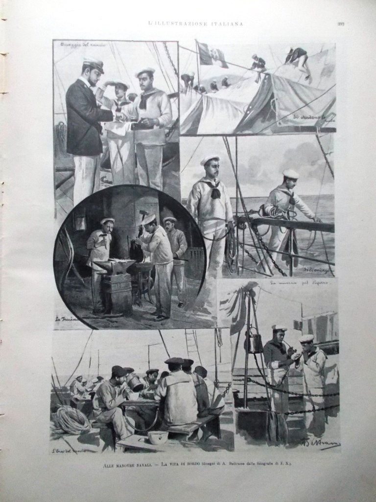 Manovre navali: la vita di bordo (due disegni di Achille Beltrame).