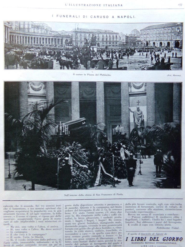 L'Illustrazione Italiana 14 Agosto 1921 Funerali Caruso Lido Venezia Monsumano