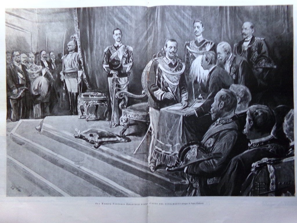 Sua maestà Vittorio Emanuele III firma l'atto del giuramento (Dante Paolocci) (stampa in 2 pagine)