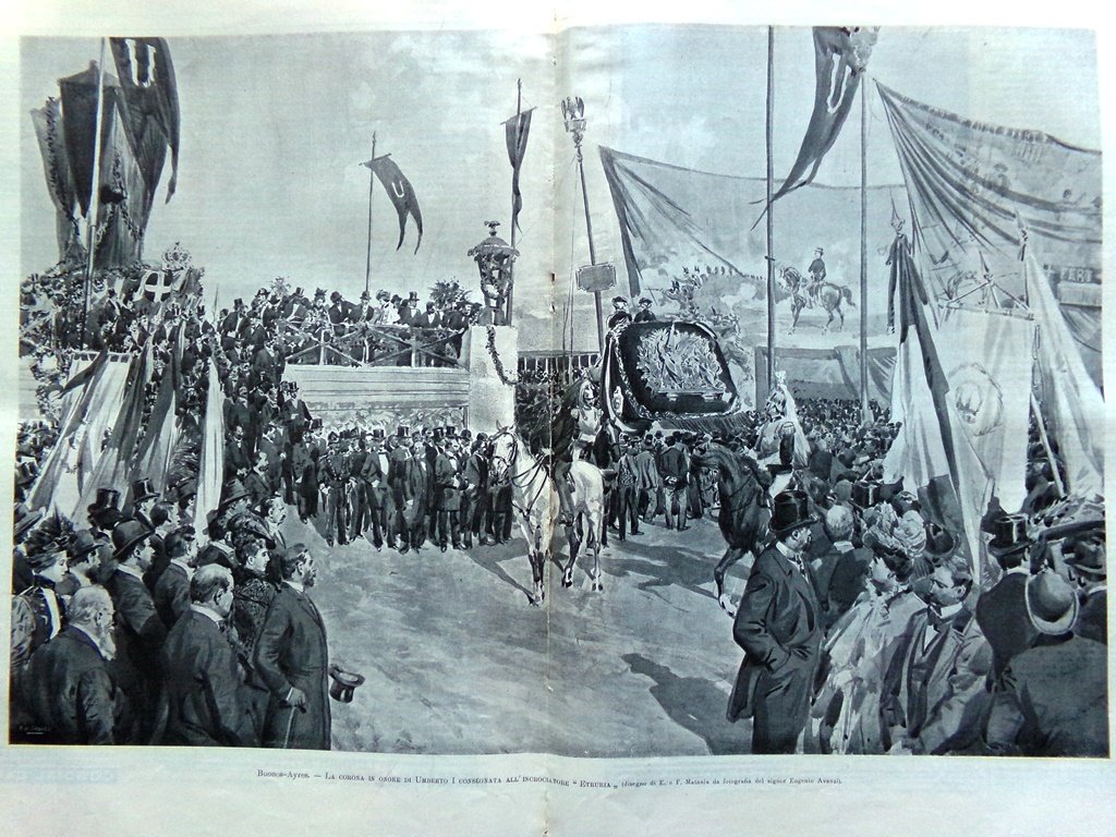 Buenos Aires: la corona in onore di Umberto I consegnata all'incrociatore "Etruria" (E. e F. Matania) (stampa in 2 pagine)