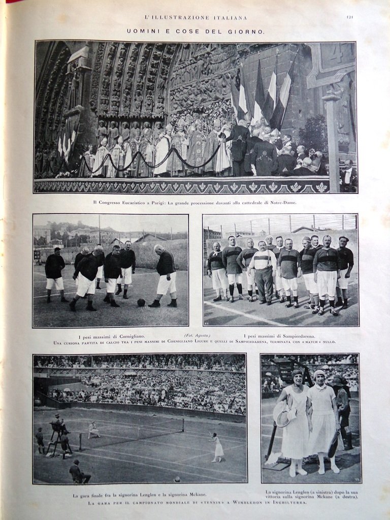 Uomini e cose del giorno: il congresso eucaristico a parigi, una partita di calcio tra i pesi massimi di Cornigliano Ligure e quelli di Sampierdarena, la gara di tennis a Wimbledon (Lenglen, Mckane)
