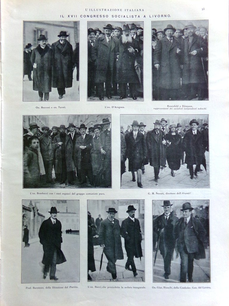 Il congresso socialista a Livorno: Bocconi, Turati, D'Aragona, Rosenfeld e Ditmann, Bombacci, Serrati, Baratono, Bacci, Bianchi, Gennari, Altobelli, Kabacieff, Buozzi, Barberis, Maffi, Mazzoni, Cavina