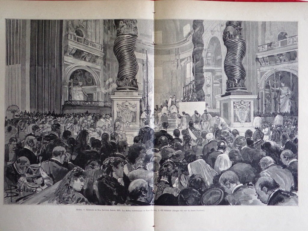 Roma: giubileo di Sua Santità Leone XIII. La mensa pontificale in San Pietro il 19 febbraio (Dante Paolocci) (stampa a 2 pagine)