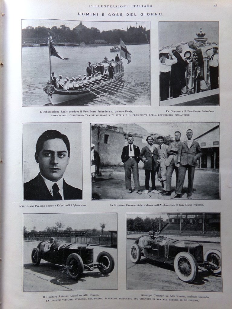 Uomini e cose del giorno: l'ing. Dario Piperno ucciso a Kabul, la vittoria italiana nel Gran Premio d'Europa Antonio Ascari e Giuseppe Campari, la guerra in Marocco con il sultano Mulay Yussuf in giro di propaganda, la posa della prima pietra dell'autostrada Napoli-Salerno