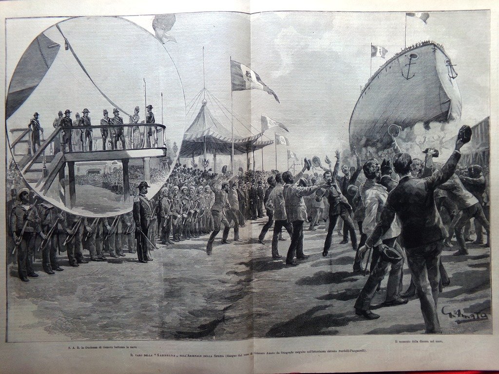 Il varo della "Sardegna" nell'arsenale della Spezia (Stampa a 2 pagine) (Gennaro Amato)