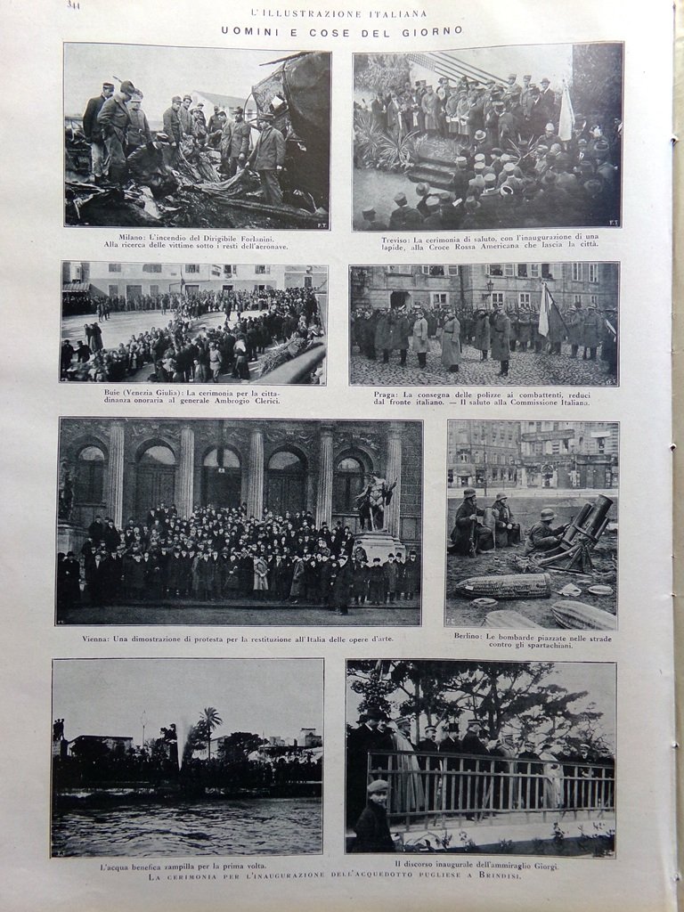 Uomini e cose del giorno: l'incendio del dirigibile Forlanini a Milano, una cerimonia a Treviso, l'inaugurazione dell'acquedotto pugliese a Brindisi