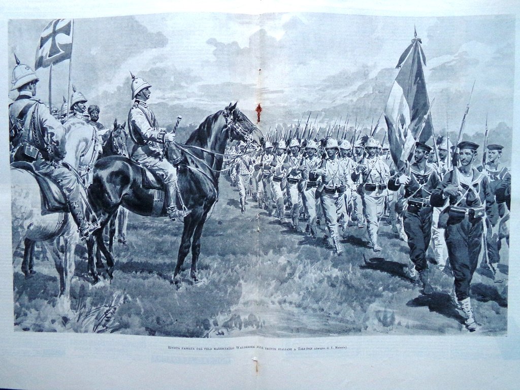 Rivista passata dal feld maresciallo Waldersee alle truppe italiane a Tientsin (F. Matania) (stampa in 2 pagine)