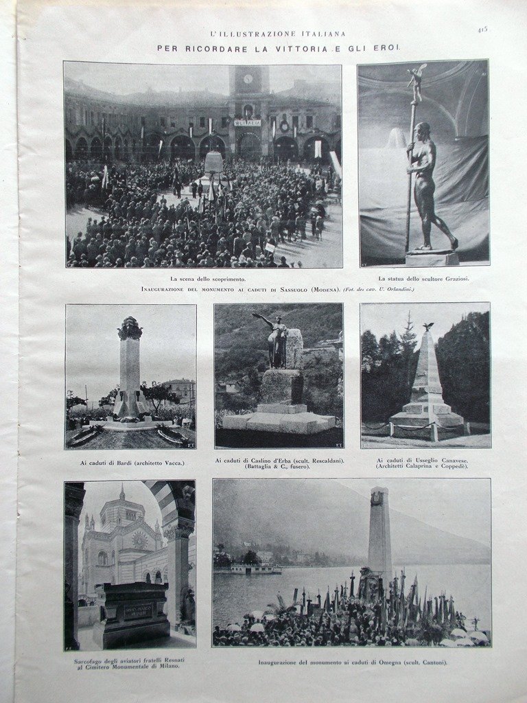 Per ricordare la vittoria e gli eroi (monumenti): Sassuolo (Graziosi), Bardi (Vacca), Caslino d'Erba (Rescaldani), Usseglio Canavese (Calaprina e Coppedè), Omegna (Cantoni)