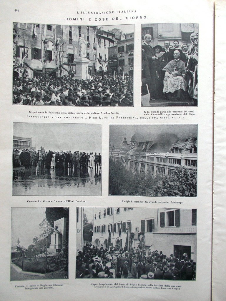 Uomini e cose del giorno: inaugurazione del monumento a Pier Luigi da Palestrina, nella sua città natale, l'incendio dei magazzini Primtemps a Parigi