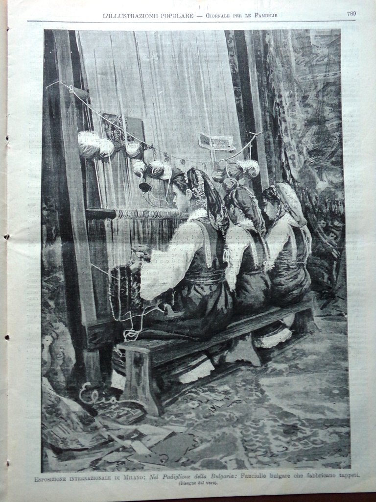 Esposizione di Milano: fanciulle bulgare che fabbricano tappeti (stampa)