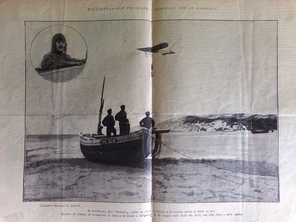 Il Bleriot di Giacomo di Lesseps lascia le dune di Calais (Stampa a 2 pagine)