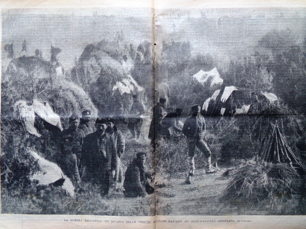 La guerra balcanica: un bivacco nelle trincee bulgare davanti ad Adrianopoli assediata (Stampa a 2 pagine)