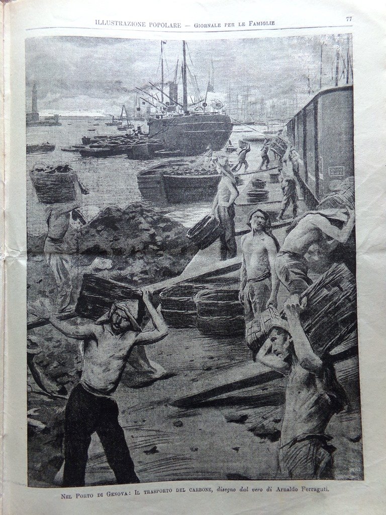 Nel porto di Genova - il trasporto del carbone (Arnaldo Ferraguti) (Stampa)