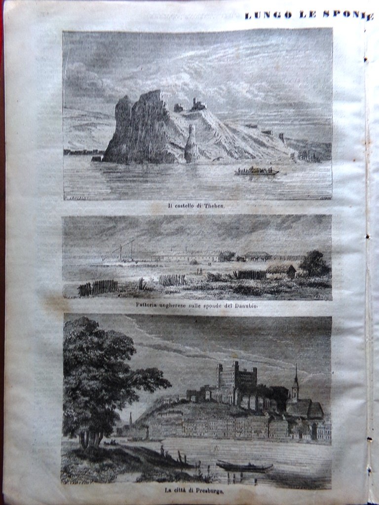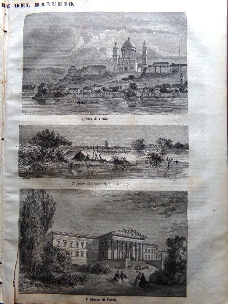 Lungo le sponde del Danubio (diverse stampe) - museo di Pesth, veduta di Gran, castello di Theben, Presburgo