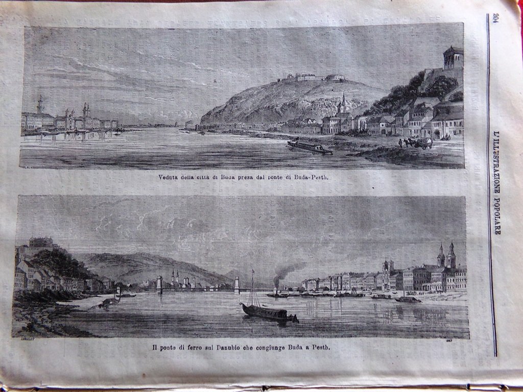 Bozzetti ungheresi (2) - il ponte di ferro sul Danubio, veduta della città di Buda (stampe)
