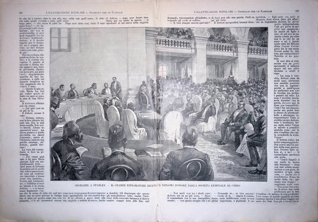 Onoranze a Stanley - il grande esploratore riceve un diploma d'onore dalla società Kediviale al cairo (stampa a 2 pagine)