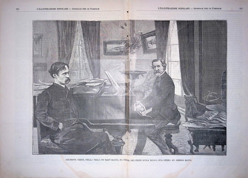 Giuseppe Verdi nella villa di Sant'Agata fa udire dei pezzi d'una nuova sua opera ad Arrigo Boito (stampa a 2 pagine)