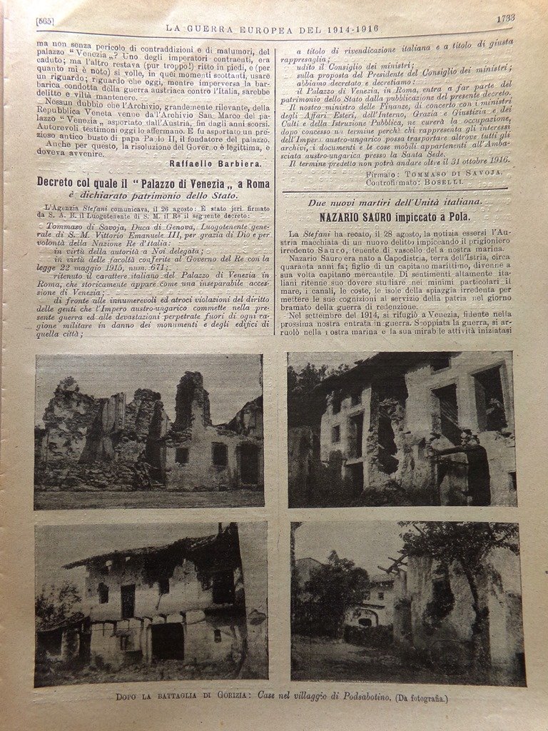L'Illustrazione Popolare 7 Settembre 1916 WW1 Nazario Sauro Chiesa Elena Venezia