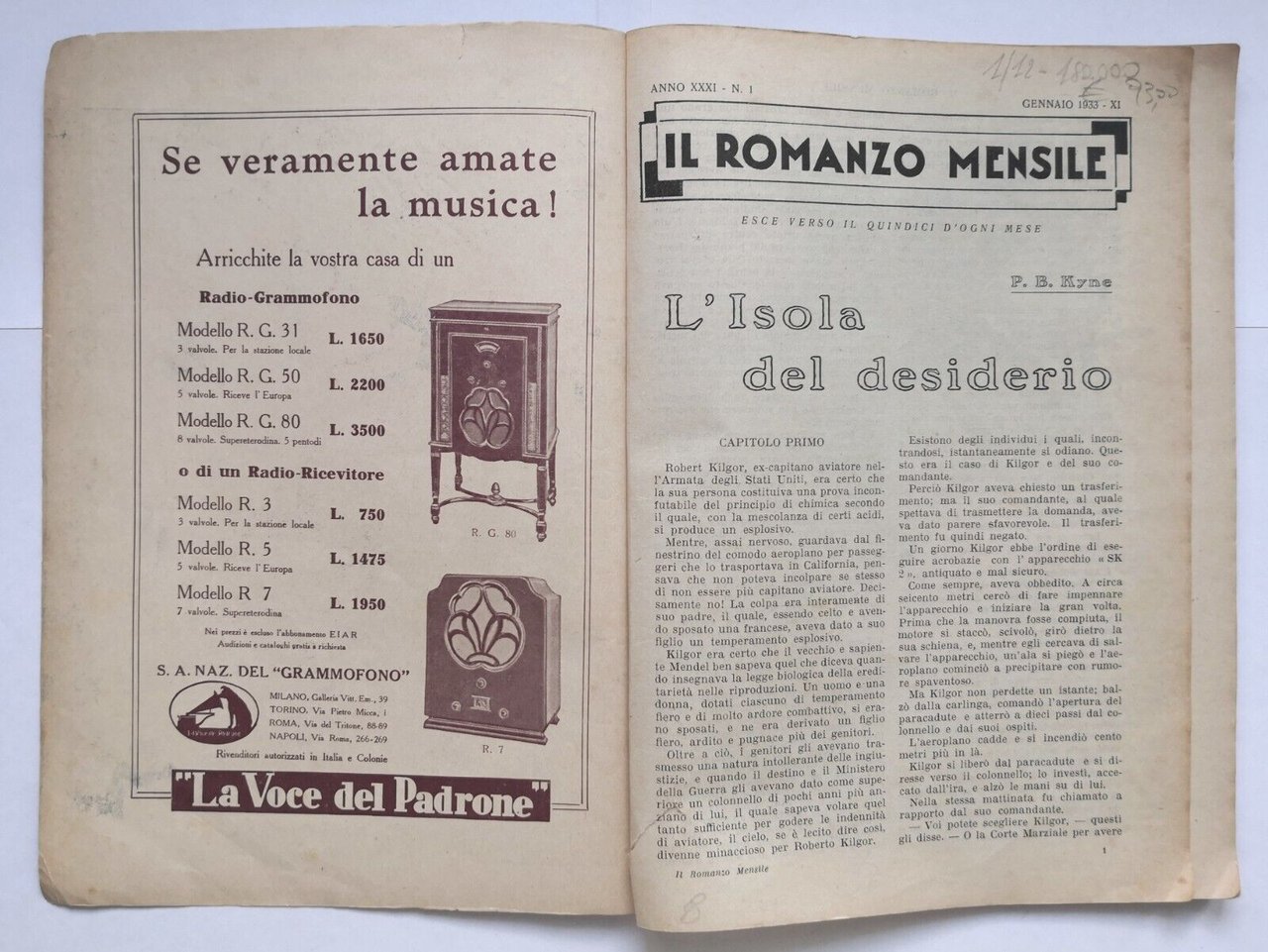 L'ISOLA DEL DESIDERIO di P. B. Kyne. Rivista "Il romanzo mensile" Numero 1 gennaio 1933.