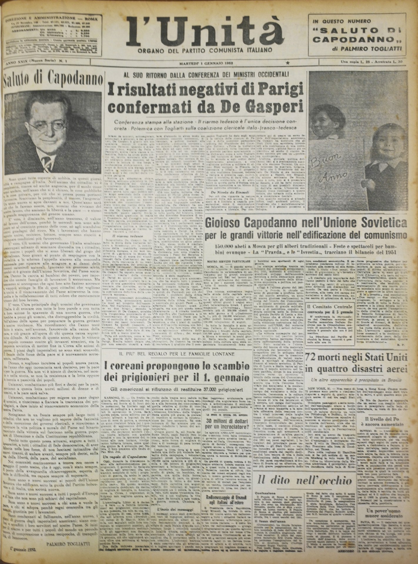 In folio, 3 volumi, mz. tela mod., titolo oro al dorso. Di questo importante quotidiano politico, di pp. 6 cad. numero, offriamo l'annata del 1952, completo in 350 numeri (a partire dal 24 marzo l'Unità viene pubblicato anche di lunedì), divisa in tre quadrimestri. Mancano 4 pp., dedicate allo Sport, al numero speciale 244. Esemplare con timbro di biblioteca e relativa dismissione, ben conservato.