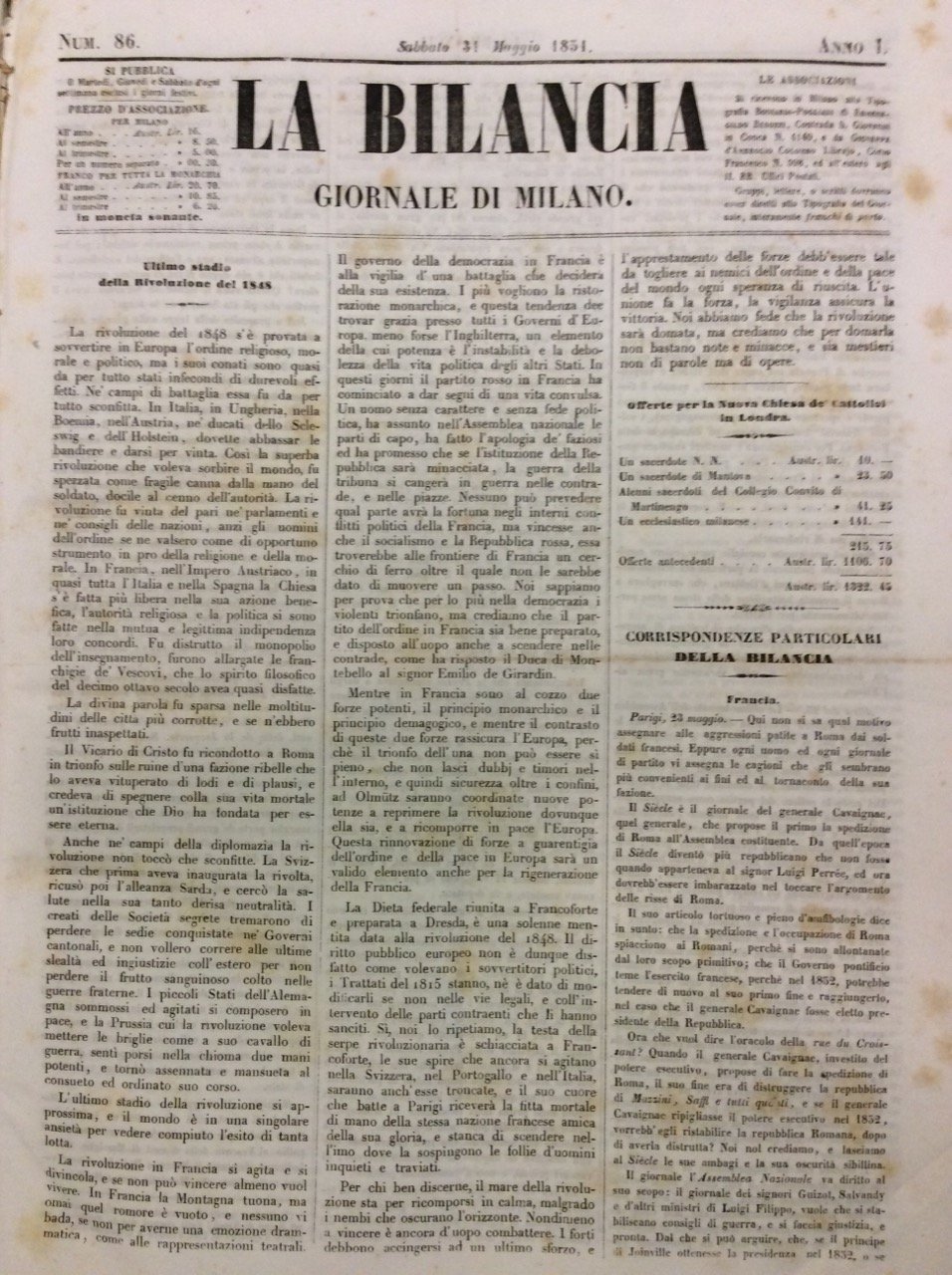 In-folio (mm. 400x282), 3 volumi, mz. pergamena coeva (qualche abras. ai piatti), titolo oro su tassello al dorso, pp. 712; 596; 596. Offriamo le prime 3 annate, dal n. 1, 5 Novembre 1850 (Anno I) al n. 149, 29 Dicembre 1853 (Anno III) di questa rivista trisettimanale di carattere politico, che veniva pubblicata il martedì, il giovedì e il sabato. Editori erano il Duca Tomaso Scotti e il Conte Luigi Confalonieri, redattore l'ing. Angelo Somazzi. Le annate sono complete ad eccezione del 1853 cui mancano 3 numeri: 6, 10 e 11.Angelo Somazzi (1803-1892), ingegnere, architetto, politico e giornalista svizzero. Stabilitosi a Milano lanciò il giornale "La Bilancia", di cui Bertazzi fu il Direttore responsabile. Si trattava di un giornale ligio all'Austria, con però un occhio rivolto al Ticino, intorno alle cui vicende recava spesso notiziari e articoli: e la sua incidenza negli affari del Cantone è documentata dalle stesse polemiche che "La Bilancia" suscitava nei giornali radicali, quasi fosse anch'essa un giornale cantonale. Durò fino al 1859, cioè fino al cambiamento del regime politico a Milano, a seguito della seconda guerra di Indipendenza italiana. Il Somazzi diresse altri giornali austriaci: la Gazzetta Ufficiale di Milano e la Gazzetta Ufficiale di Venezia. Solo qualche lieve fiorit., altrimenti la raccolta è ben conservata.