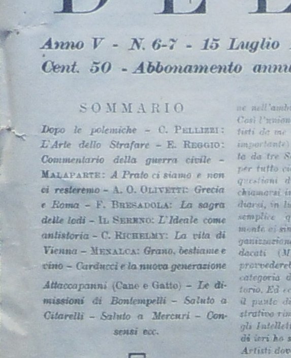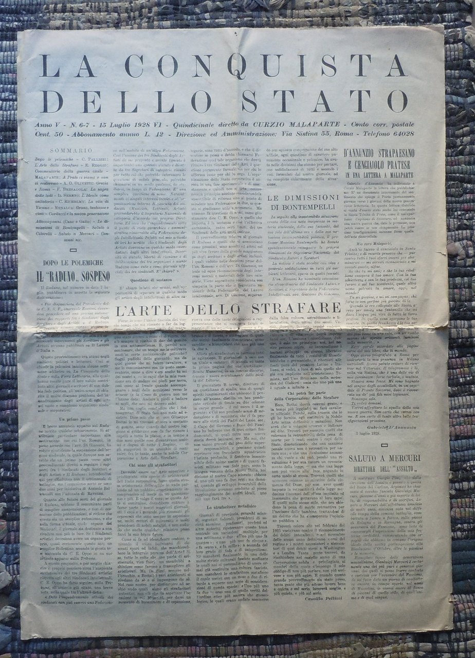 Formato in folio, cm 54, pagine 4. Pieghe centrali. Articoli di Malaparte, D'annunzio, Carlo Richelmy.