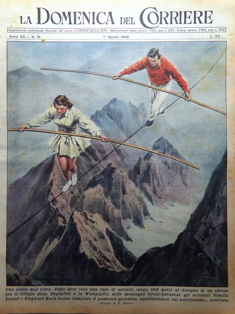 Dopo aver teso una fune di metallo lunga 160 metri al disopra di un abisso tra il rifugio della Zugspitze e la Westgipfel, nelle montagne tirolo-bavaresi, gli acrobati Gisella Lenort e Siegwart Bach hanno compiuto il pazzesco percorso, equilibrandosi sul sottilissimo. sentiero (Walter Molino)