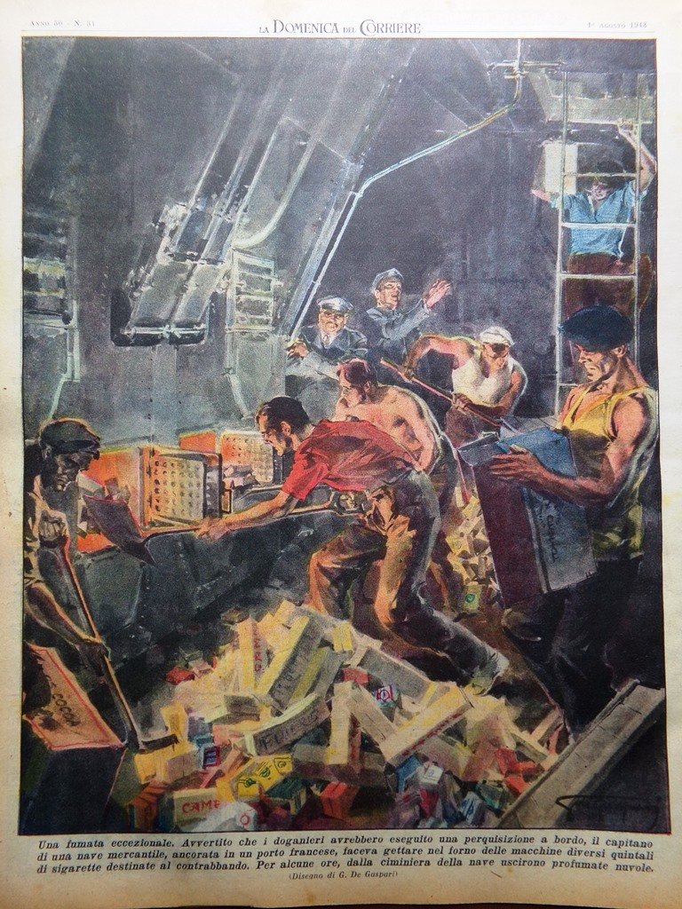 Una fumata eccezionale. Avvertito che i doganieri avrebbero eseguito una perquisizione a bordo, il capitano di una nave mercantile, ancorata in un porto francese, faceva gettare nel forno delle macchine diversi quintali di sigarette destinate al contrabbando (Walter Molino)