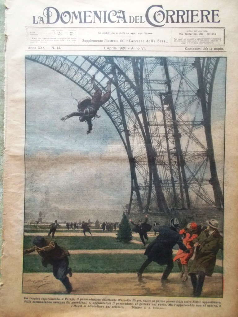 Un tragico esperimento. A Parigi, il paracadutista dilettante Marcello Haget, salito al primo piano della torre Eiffel, approfittava della momentanea assenza dei guardiani e, aggiustatosi il paracadute si gettava nel vuoto, ma l'apparecchio non si apriva e Haget si sfracellava sul selciato (Achille Beltrame)