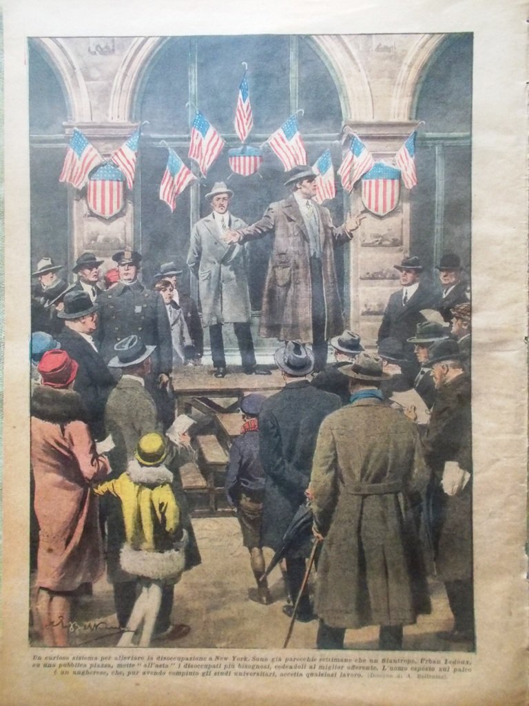 Un curioso sistema per alleviare la disoccupazione a New York. Sono già parecchie settimane che un filantropo, Urban Ledoux, su una pubblica piazza, mette all'asta i disoccupati più bisognosi cedendoli al miglior offerente (Achille Beltrame)
