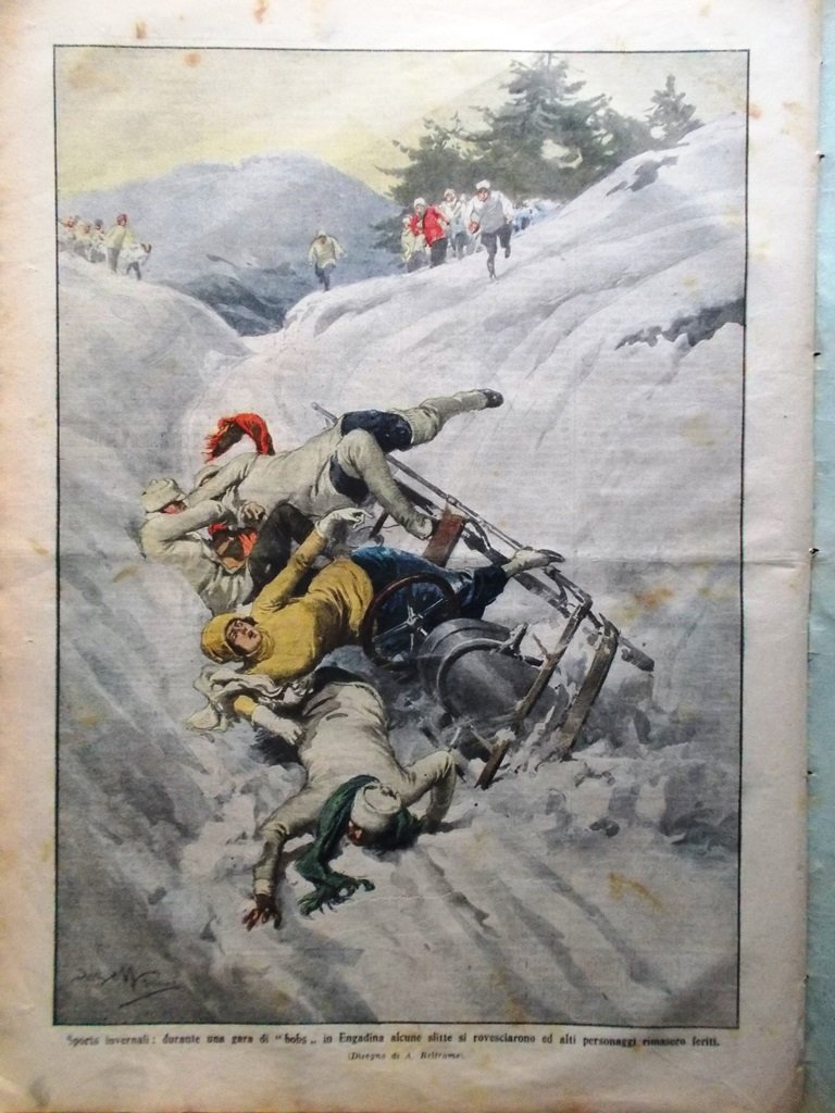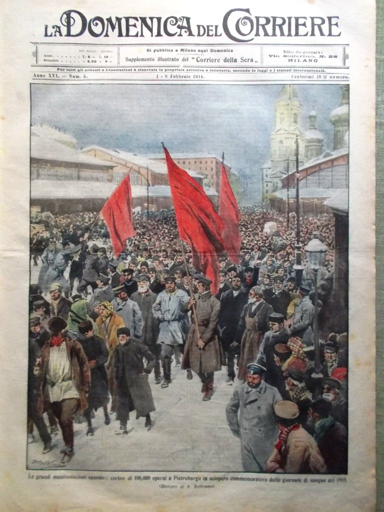 LA DOMENICA DEL CORRIERE Rivista Originale del 1 Febbraio 1914 Anno 16 nr. 5 pagine: 16 dimensioni: 38 x 28 cm IN PRIMA PAGINA: Le grandi manifestazioni operaie: corteo di 100 mila operai a Pietroburgo in sciopero commemorativo delle giornate di sangue del 1905 (Achille Beltrame) NELL'ULTIMA PAGINA: Sport invernali: durante una gara di "bob" in Engadina alcune slitte si rovesciarono ed alti personaggi rimasero feriti (Achille Beltrame) ALL'INTERNO: Nazionalismo e alpinismo: il nuovo rifugio alle Bocche del Brenta in contestazione Il nuovo regno di Albania Haid Daihl che gira l'Europa per vendicarsi La corazzata ungherese "Szent Istvan" varata a Fiume Dov'è Leonardo ? Sistemata a Roma l'isola Tiberina La morte del cantante Salvatore Gambardella e di Domenico Porro CONDIZIONI DELLA RIVISTA: BUONE, NORMALI SEGNI DEL TEMPO, SOVRACOPERTINE PRESENTI NOTE PARTICOLARI: MACCHIE DEL TEMPO IN ALCUNE PAGINE
