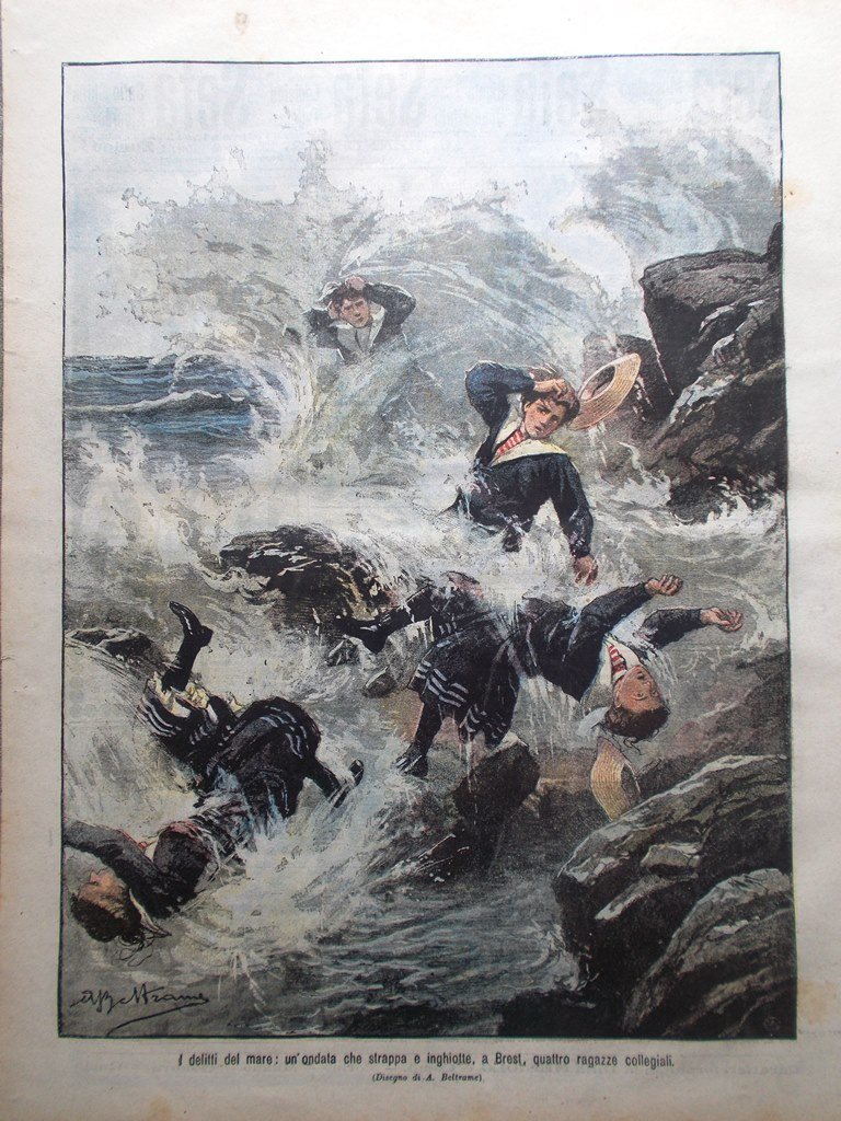 I delitti del mare: un'ondata che strappa e inghiotte a Brest quattro ragazze collegiali (Achille Beltrame)