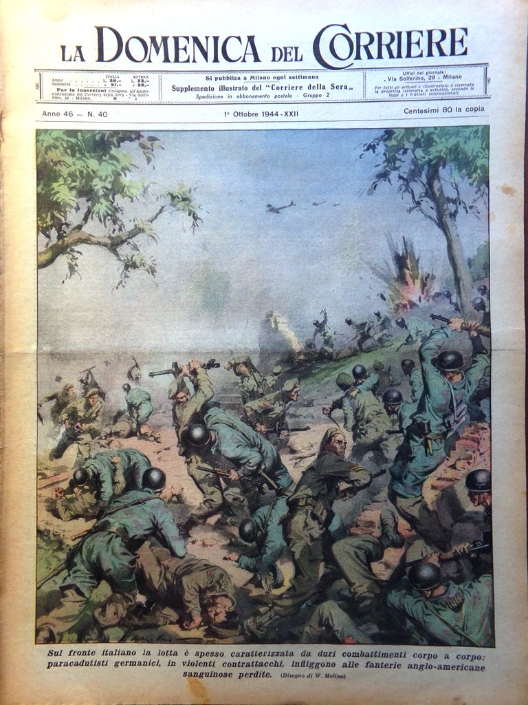 Sul fronte italiano la lotta spesso caratterizzata da duri combattimenti corpo a corpo: paracadutisti germanici, in violenti contrattacchi, infliggono alle fanterie anglo-americane sanguinose perdite (Walter Molino)