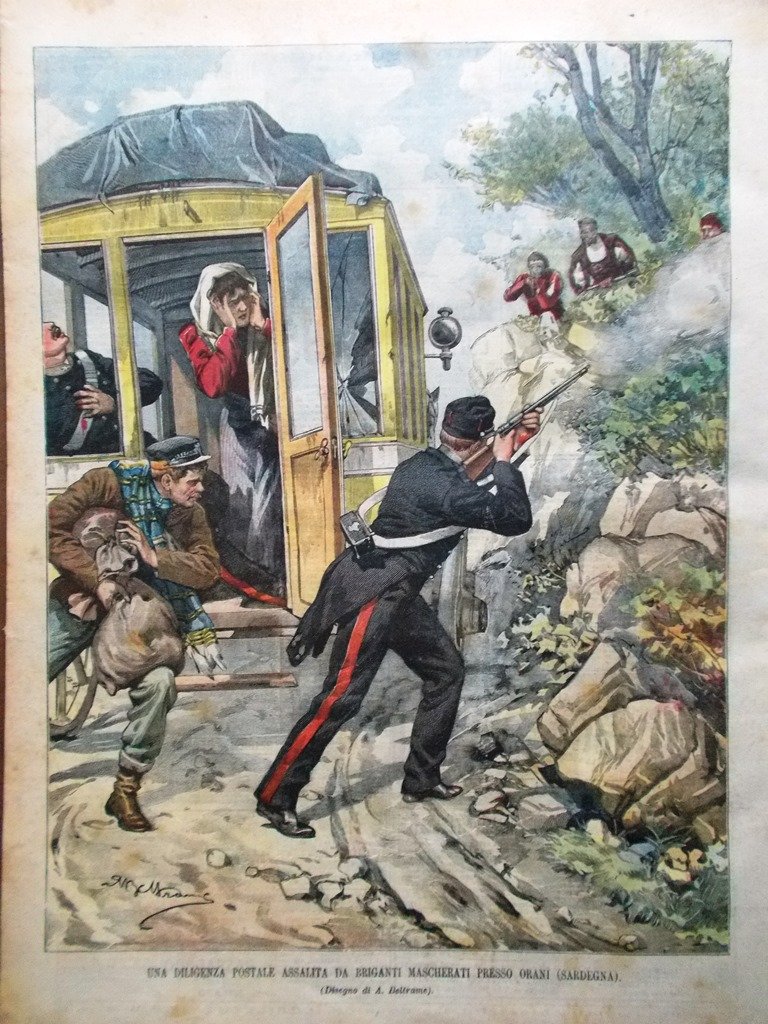 Una diligenza postale assalita da briganti mascherati presso Orani (Sardegna) (Achille Beltrame)