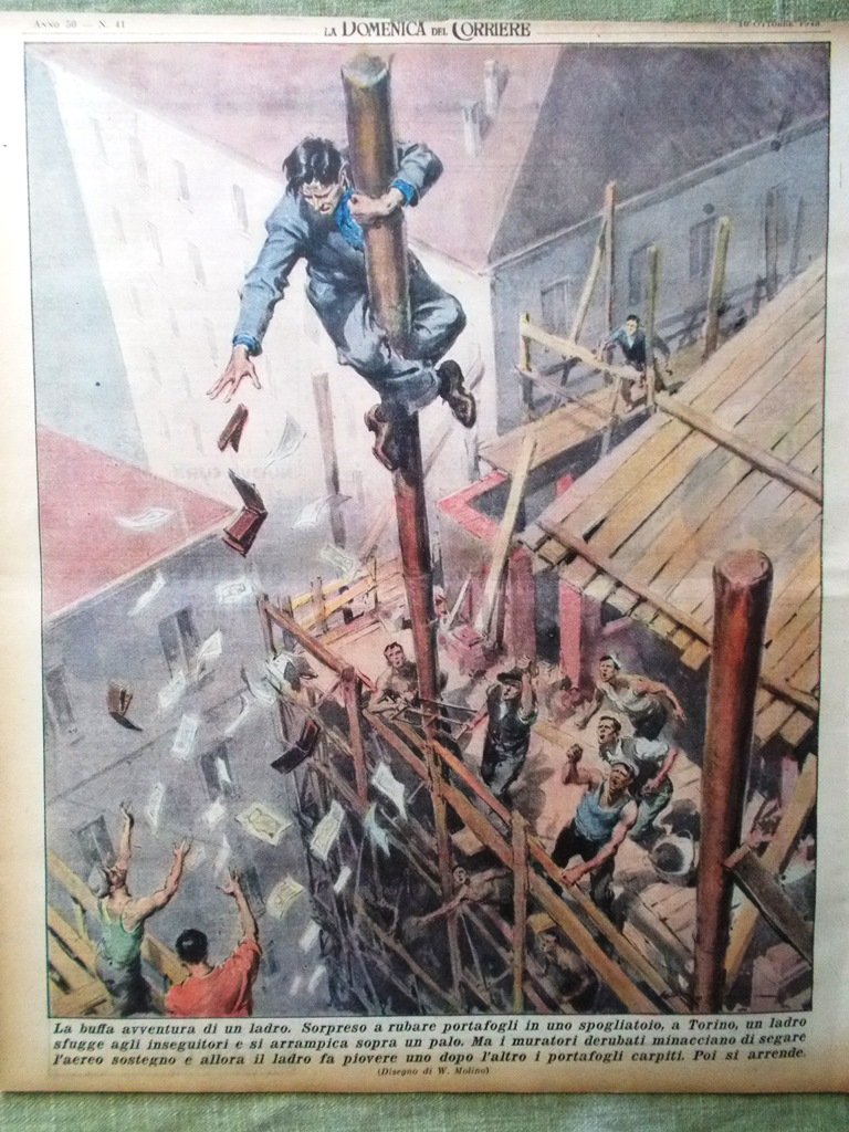 La buffa avventura di un ladro. Sorpreso a rubare portafogli in uno spogliatoio, a Torino, un ladro sfugge agli inseguitori e si arrampica sopra un palo. Ma i muratori derubati minacciano di segare l'aereo sostegno e allora il ladro fa piovere uno sopra l'altro i portafogli carpiti. Poi si arrende (Walter Molino)