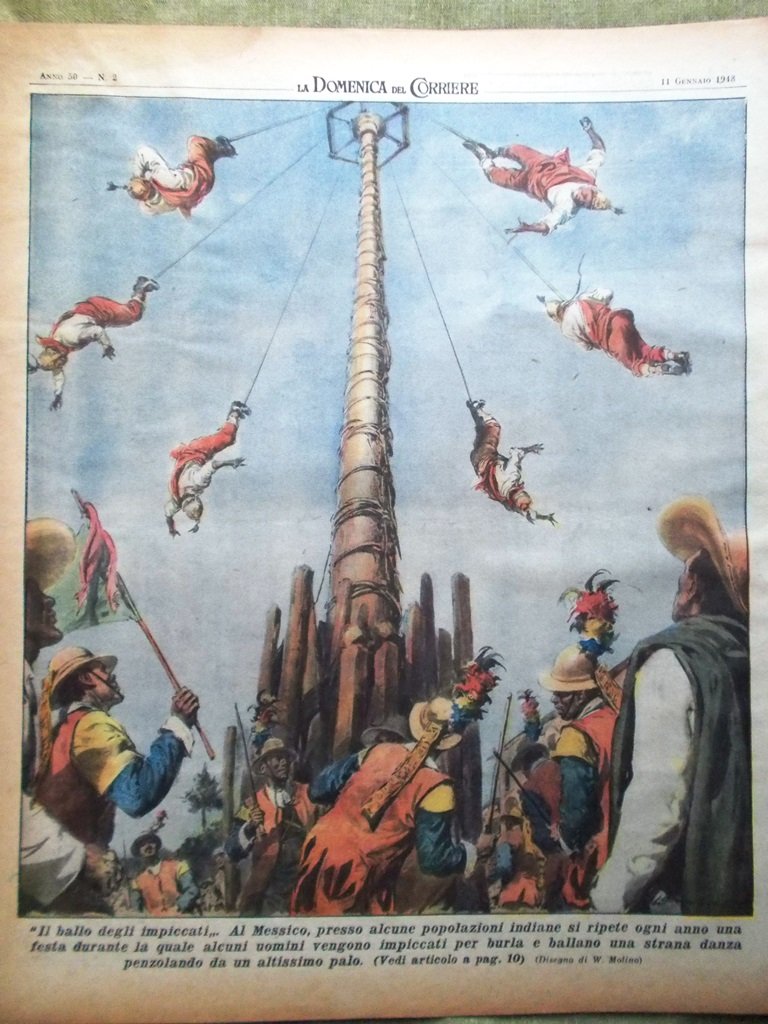 "Il ballo degli impiccati". Al Messico presso alcune popolazioni indiane si ripete ogni anno una festa durante la quale alcuni uomini vengono impiccati per burla e ballano una strana danza penzolando da un altissimo palo (Walter Molino)