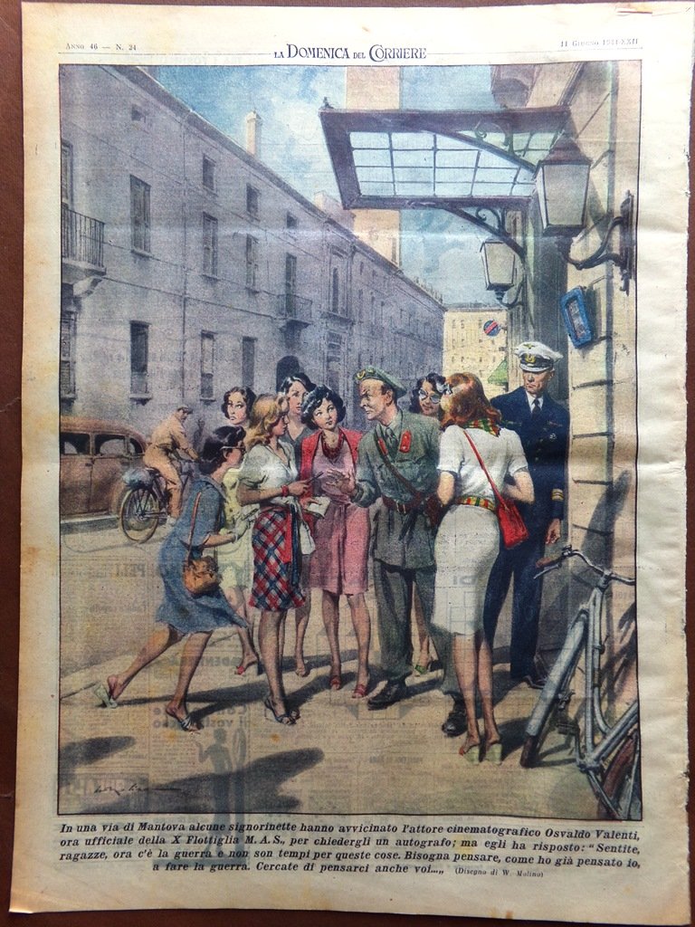 In una via di Mantova alcune signorinette hanno avvicinato l'attore cinematografico Osvaldo Valenti, ora ufficiale della X Flottiglia MAS per chiedergli un autografo; ma egli ha risposto: "Sentite ragazze, ora c'è la guerra e non son tempi per queste cose. Bisogna pensare a fare la guerra. Cercate di pensarci anche voi." (Walter Molino)
