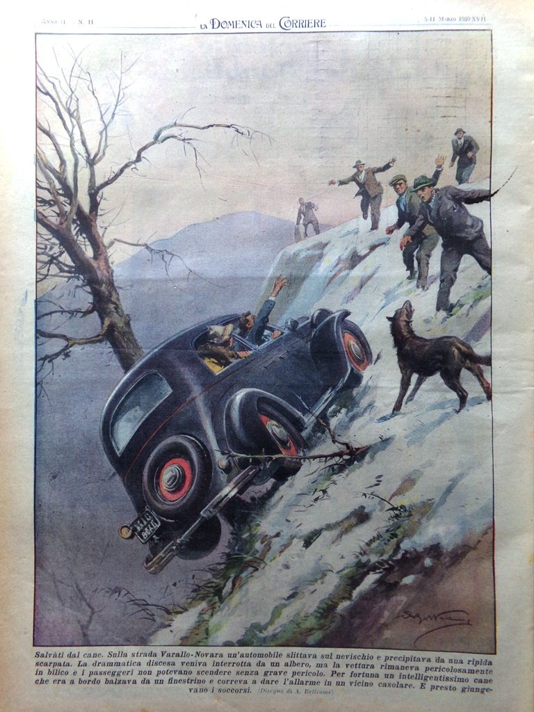 Salvati dal cane. Sulla strada Varallo-Novara un'automobile slittava sul nevischio e precipitava da una ripida scarpata. La drammatica discesa veniva interrotta da un albero ma la vettura rimaneva pericolosamente in bilico e i passeggeri non potevano scendere senza grave pericolo. Per fortuna un intelligentissimo cane che era a bordo balzava da un finestrino e correva a dare l'allarme (Achille Beltrame)