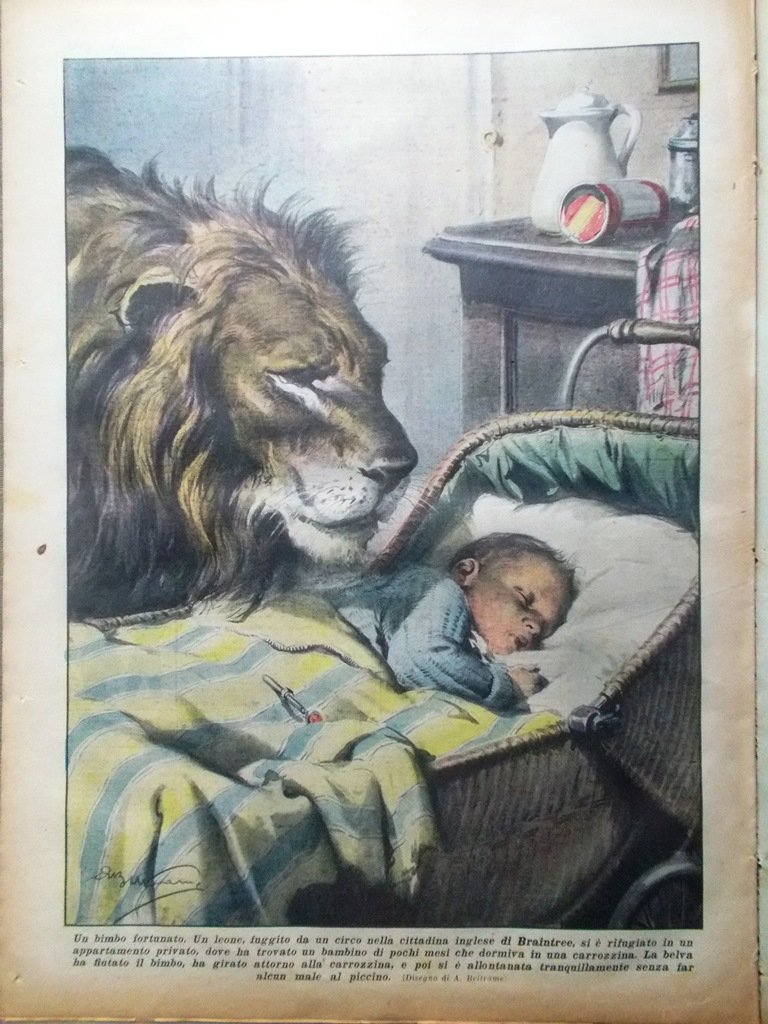 Un leone, fuggito da un circo nella cittadina inglese di Braintree si è rifugiato in un appartamento privato dove ha trovato un bambino di pochi mesi che dormiva in una carrozzina. La belva ha fiutato il bimbo, ha girato intorno alla carrozzina e poi si è allontanata tranquillamente senza far alcun male al piccino (Achille Beltrame)
