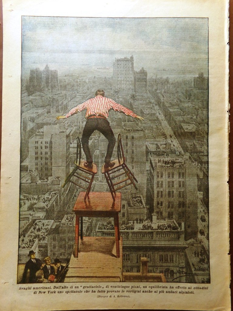 Svaghi americani. Dall'alto di un "grattacielo" di 25 piani, un equilibrista ha offerto ai cittadini di New York uno spettacolo che ha fatto provare le vertigini anche ai più audaci alpinisti (Achille Beltrame)