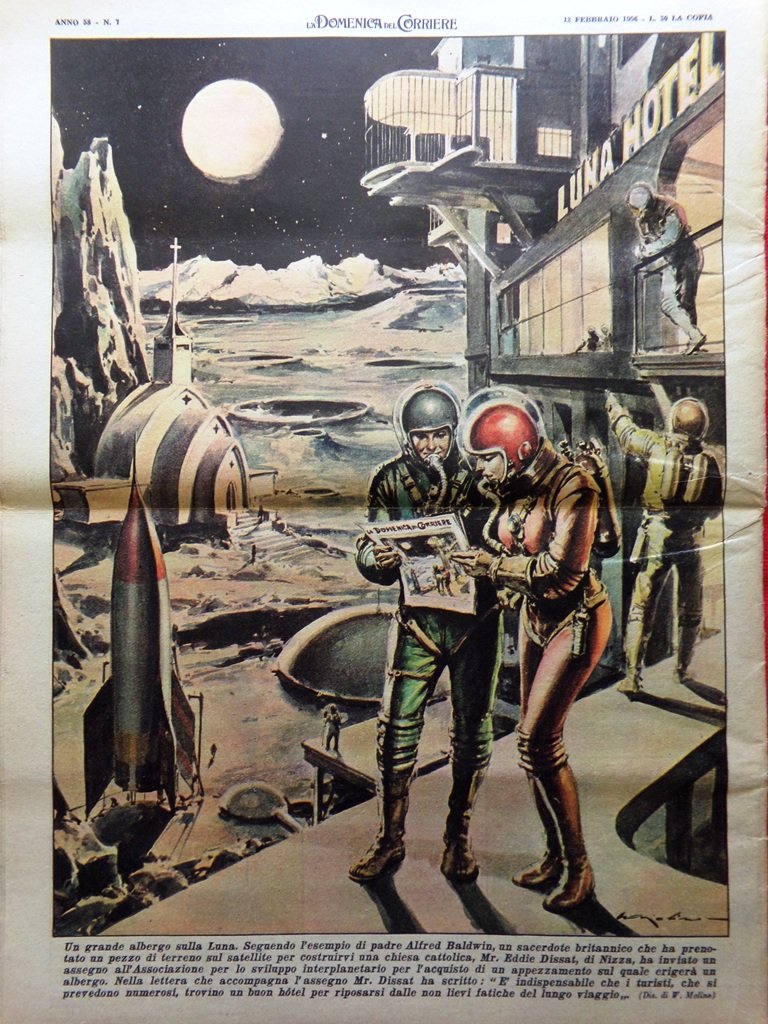 Un grande albergo sulla Luna. Seguendo l'esempio di padre Alfred Baldwin, un sacerdote britannico che ha prenotato un pezzo di terreno sul satellite per costruirvi una chiesa cattolica, Mr. Eddie Dissat, di Nizza, ha inviato un assegno all'Associazione per lo sviluppo interplanetario per l'acquisto di un appezzamento sul quale erigerà un albergo. Nella lettera che accompagna l'assegno Mr. Dissat ha scritto: "È indispensabile che i turisti, che si prevedono numerosi, trovino un buon hotel per riposarsi dalle non lievi fatiche del lungo viaggio" (disegno di Walter Molino)