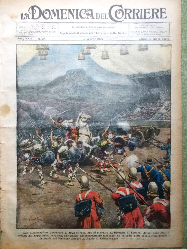 LA DOMENICA DEL CORRIERE Rivista Originale del 12 Giugno 1927 Anno 29 nr. 24 pagine: 16 dimensioni: 38 x 28 cm IN PRIMA PAGINA: Una ricostruzione guerresca al Real Torneo che si è svolto all'Olympia di Londra. Attori sono stati i soldati dei reggimenti scozzesi, che hanno pittorescamente revocato un episodio della storia della Scozia: la morte del Visconte Dundee al Passo di Killiecrankie (Achille Beltrame) NELL'ULTIMA PAGINA: La tragica fine di una cerimonia nuziale al Messico. Il comando di Leon, appreso che il reverendo Sold stava per celebrare un matrimonio, inviava sul posto una truppa che si impadroniva del prete, di un altro sacerdote, degli sposi e di un notaio. Tutti furono trascinati sulla strada e fucilati senza pietà (Achille Beltrame) ALL'INTERNO: Lindbergh a Londra. Il Re a Como per l'inaugurazione delle Mostre Voltiane. Il consiglio nazionale dell'associazione combattenti ricevuto da Mussolini al Viminale La più antica città del mondo, Mitzkhet la misteriosa (Mtskheta) La cattedrale di Reims riaperta al pubblico. Bomba nella scuola di Bath, nel Michigan: 43 vittime. Inondazione in Louisiana. CONDIZIONI DELLA RIVISTA: BUONE, NORMALI SEGNI DEL TEMPO, SOVRACOPERTINE MANCANTI NOTE PARTICOLARI: BORDO INFERIORE INTERNO LEGGERMENTE FRASTAGLIATO (COPERTINE PARZIALMENTE STACCATE)