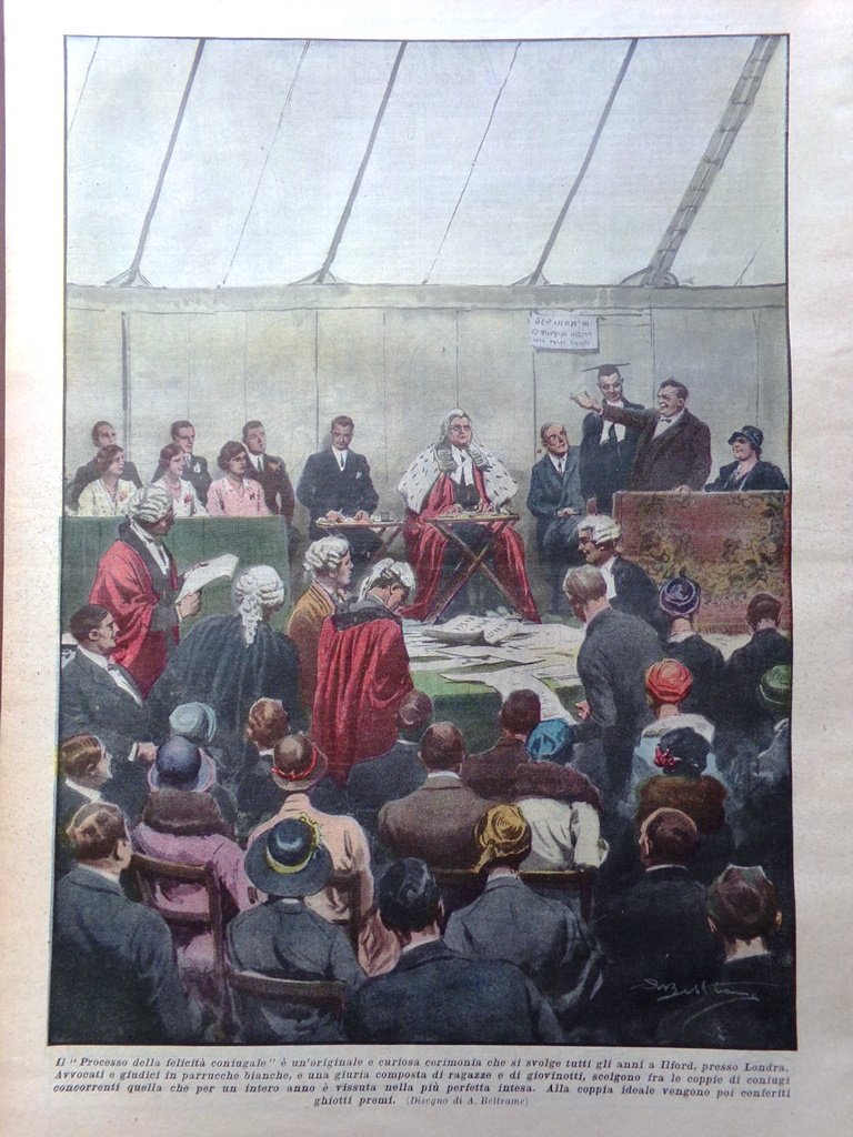 Il "Processo della felicità coniugale" è un'originale e curiosa cerimonia che si svolge tutti gli anni a Ilford, presso Londra. Avvocati e giudici in parrucche bianche, e una giuria composta di ragazze e giovinotti, scelgono fra le coppie di coniugi concorrenti quella che per un intero anno è vissuta nella più perfetta intesa. Alla coppia ideale vengono poi conferiti ghiotti premi (Achille Beltrame)