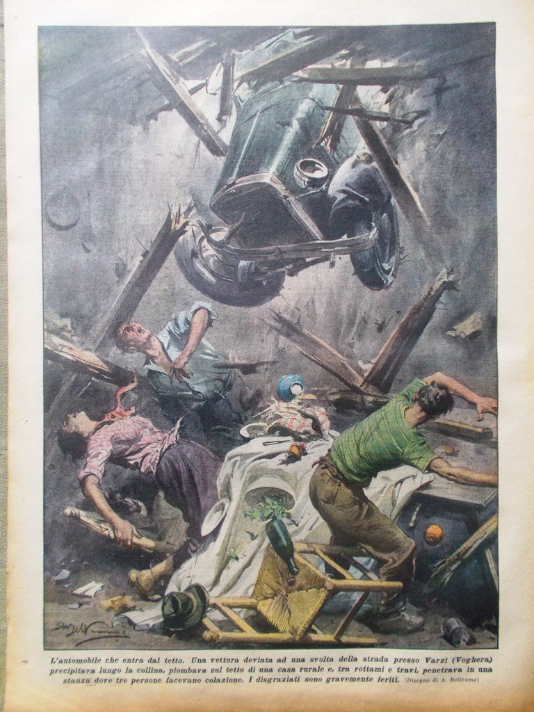 Una vettura deviata ad una svolta della strada presso Varzi (Voghera) precipitava lungo la collina, piombava sul tetto di una casa rurale e, tra rottami e travi, penetrava in una stanza dove tre persone facevano colazione. I disgraziati sono gravemente feriti (Achille Beltrame)