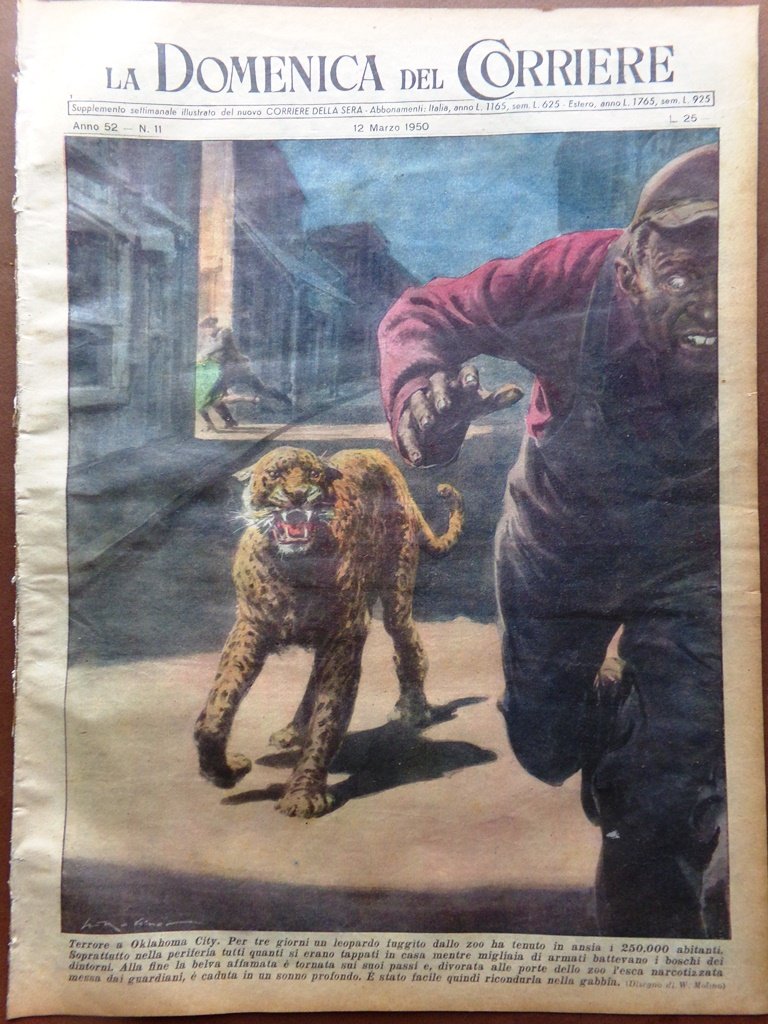 Terrore a Oklahoma City. Per tre giorni un leopardo fuggito dallo zoo ha tenuto in ansia i 250 mila abitanti. Soprattutto nella periferia tutti quanti si erano tappati in casa mentre migliaia di armati battevano i boschi dei dintorni. Alla fine la belva affamata è tornata sui suoi passi e, divorata alle porte dello zoo, l'esca narcotizzata messa dai guardiani, è caduta in un sonno profondo. È stato facile quindi ricondurla alla gabbia (Walter Molino)