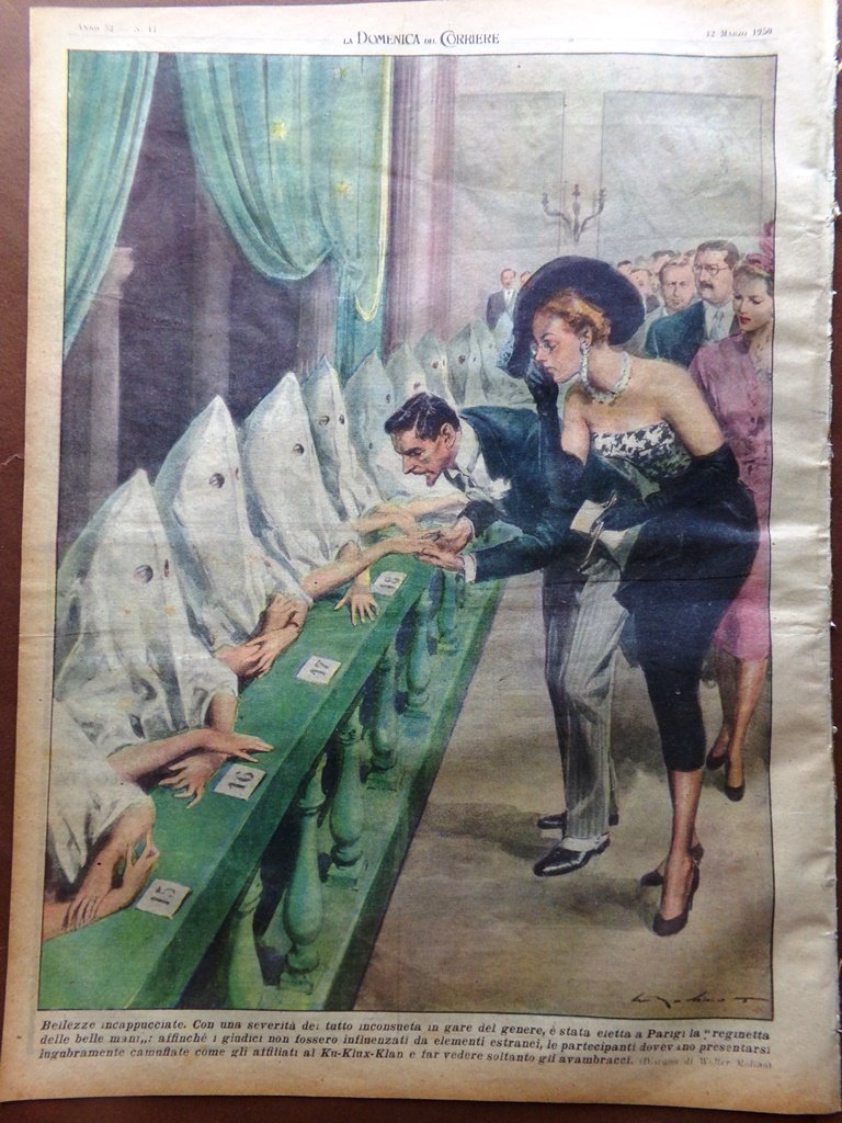 Con una severità del tutto inconsueta in gare del genere, è stata eletta a Parigi la "reginetta delle belle mani": affinché i giudici non fossero influenzati da elementi estranei, le partecipanti dovevano presentarsi lugubramente camuffate come gli affiliati del Ku Klux Klan e far vedere soltanto gli avambracci (Walter Molino)