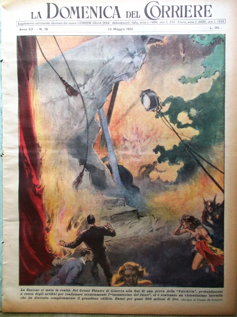 La finzione si muta in realtà. Nel Gran Théatre di Ginevra alla fine di una prova della "Valchiria" probabilmente a causa degli artifizi per realizzare scenicamente l' "incantesimo del fuoco" si è scatenato un violentissimo incendio che ha distrutto completamente il grandioso edificio. Danno per quasi 800 milioni di lire (De Gaspari)