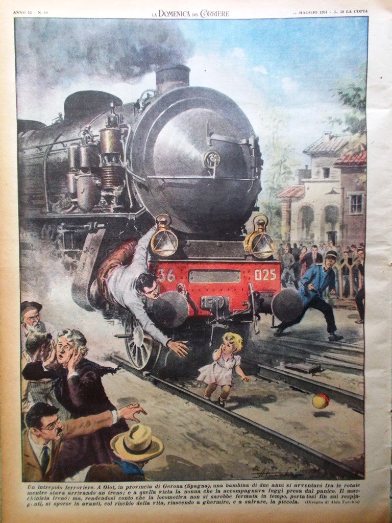 A Olot, in provincia di Gerona (Spagna) una bambina di due anni si avventurò fra le rotaie mentre stava arrivando un treno; e a quella vista la nonna che la accompagnava fuggì presa dal panico. Il macchinista frenò; ma , rendendosi conto che la locomotiva non si sarebbe fermata in tempo, portatosi fin sui respingenti, si sporse in avanti, col rischio della vita, riuscendo a ghermire, e a salvare, la piccola (Aldo Torchio)