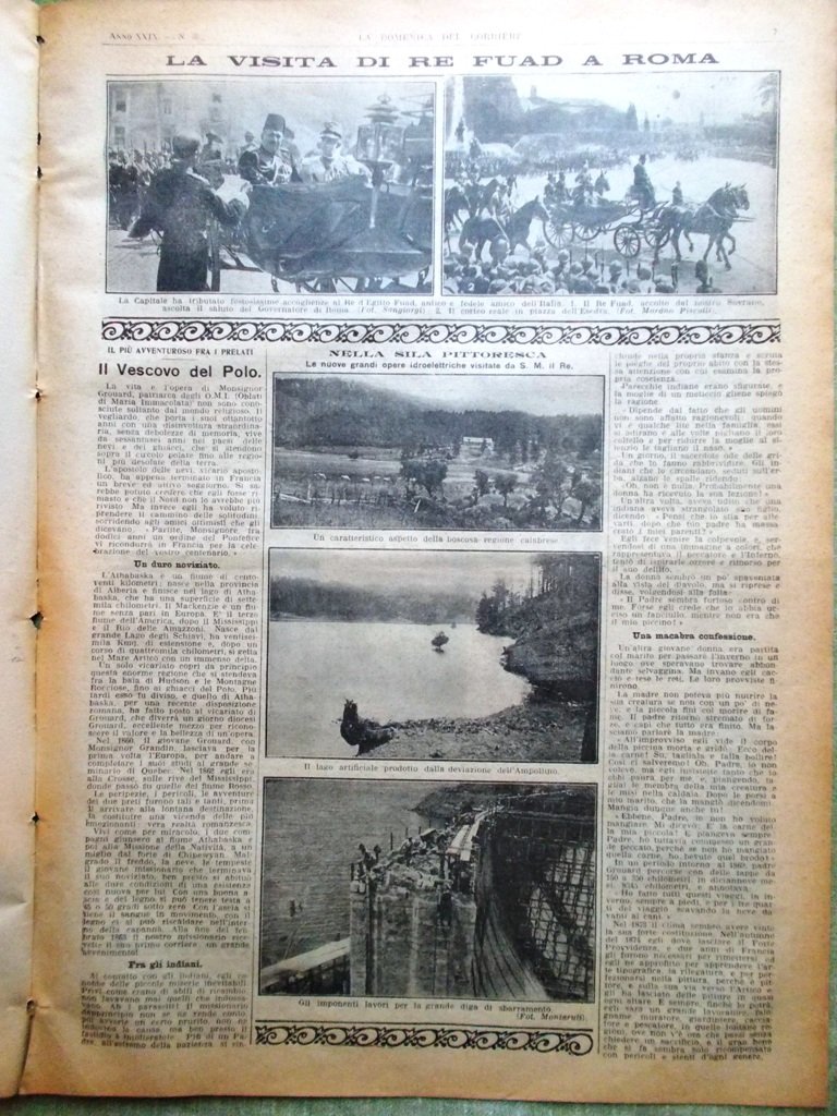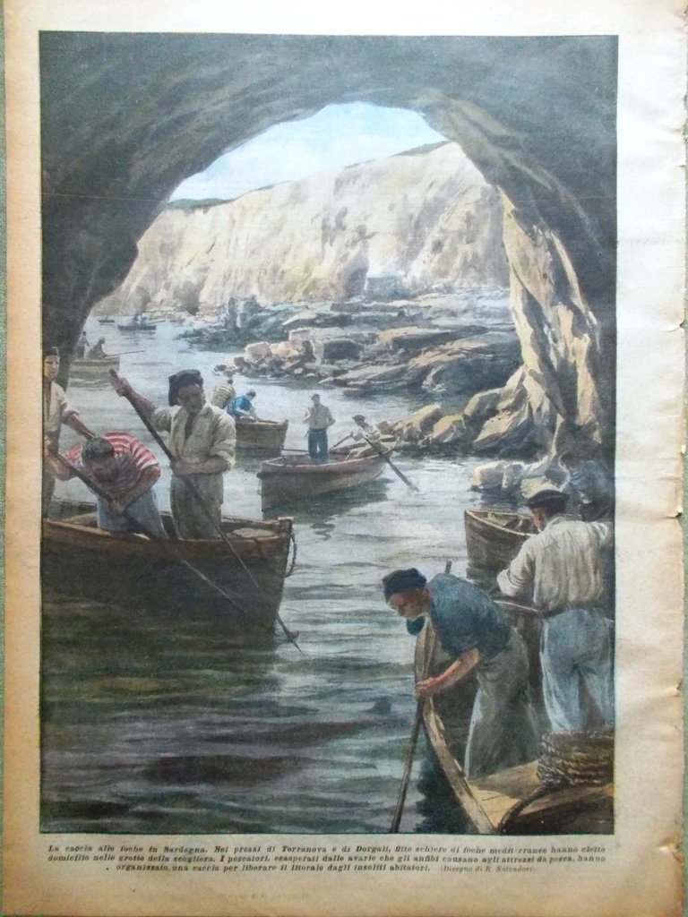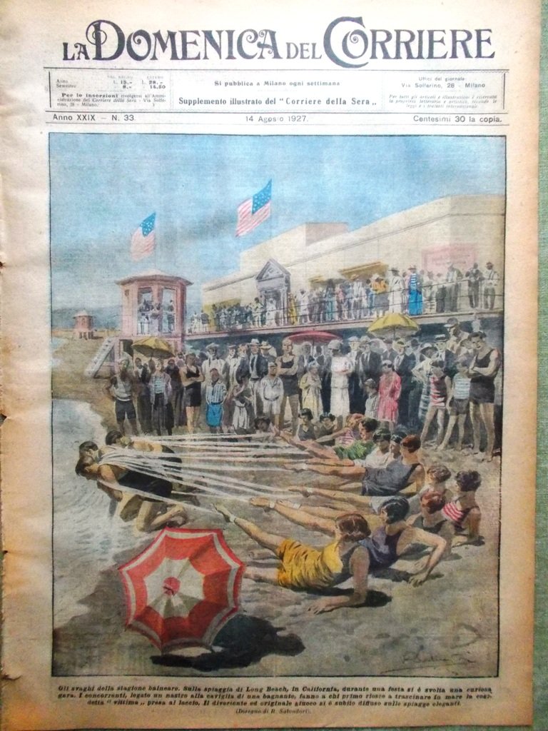 LA DOMENICA DEL CORRIERE Rivista Originale del 14 Agosto 1927 Anno 29 nr. 33 pagine: 16 dimensioni: 38 x 28 cm IN PRIMA PAGINA: Gli svaghi della stagione balneare. Sulla spiaggia di Long Beach, in California durante una festa si è svolta una curiosa gara. I concorrenti, legato un nastro alla caviglia di una bagnante, fanno a chi per primo riesce a trascinare in mare la cosiddetta vittima (Achille Beltrame) NELL'ULTIMA PAGINA: La caccia alle foghe in Sardegna. Nei pressi di Terranova e di Dorgali, fitte schiere di foche mediterranee hanno eletto domicilio nelle grotte della scogliera. I pescatori, esasperati dalle avarie che gli anfibi causano agli attrezzi da pesca hanno organizzato una vera e propria caccia (Achille Beltrame) ALL'INTERNO: La visita di Re Fuad a Roma. Le nuove grandi opere idroelettriche visitate dal Re. Morto Robert De Flers. Il vescovo del Polo Attori che si confessano: Emilio Zago Un nuovo rifugio alpino inaugurato ai piedi del Sasso Nero. Il ritorno a New York dei trasvolatori dell'Atlantico: Byrd, Chamberlin. La festa della Madonna del Carmine a Trastevere. La rinascita sportiva italiana: Binda, Girardengo, Piemontesi e Belloni Il libro d'oro dei magri: Ugo Foscolo, Sarah Bernhardt, Leopardi, Rachel CONDIZIONI DELLA RIVISTA: BUONE, NORMALI SEGNI DEL TEMPO, SOVRACOPERTINE MANCANTI NOTE PARTICOLARI: PICCOLI STRAPPETTI NEI BORDI DI ALCUNE PAGINE