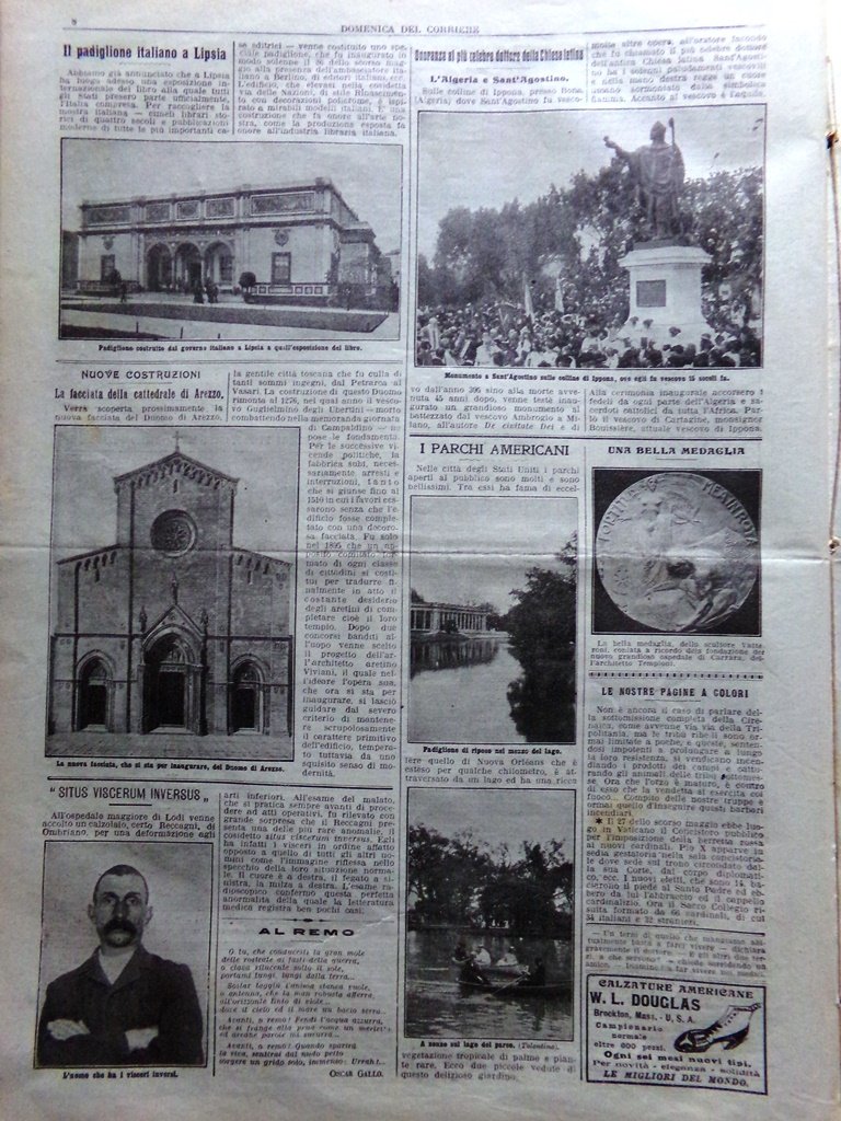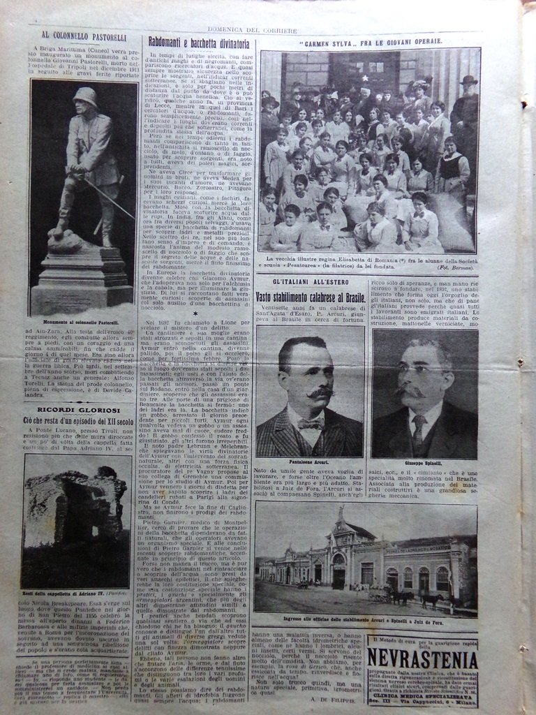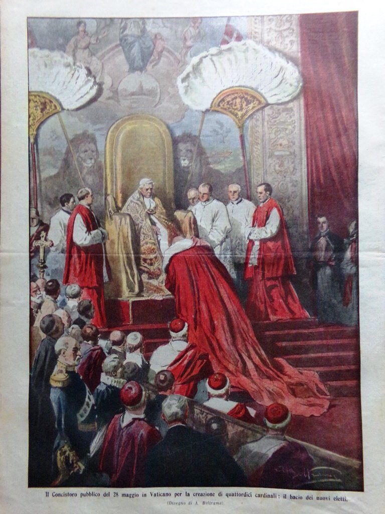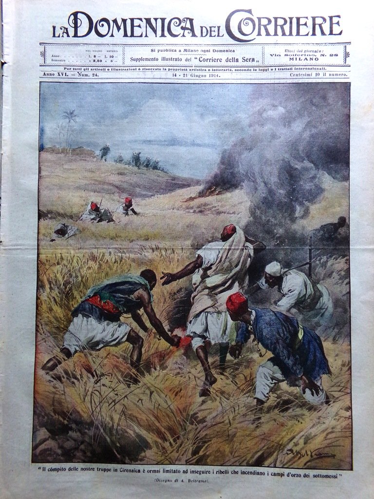 LA DOMENICA DEL CORRIERE Rivista Originale del 14 Giugno 1914 Anno 16 nr. 24 pagine: 16 (+4) dimensioni: 39 x 28 cm IN PRIMA PAGINA: Il compito delle nostre truppe in Cirenaica è ormai limitato ad inseguire i ribelli che incendiano i campi d'orzo dei sottomessi (Achille Beltrame) NELL'ULTIMA PAGINA: Il concistoro pubblico del 28 maggio in Vaticano per la creazioni di quattrordici cardinali: il bacio dei nuovi eletti (Achille Beltrame) ALL'INTERNO: Albania: stato d'assedio proclamato a Durazzo I nuovi alveari umani a Roma, a Porta S. Giovanni Ai confini del Messico La facciata della cattedrale di Arezzo Rabdomanti e bacchetta divinatoria L'Italia in Tripolitania CONDIZIONI DELLA RIVISTA: BUONE, NORMALI SEGNI DEL TEMPO, SOVRACOPERTINE PRESENTI NOTE PARTICOLARI: PICCOLISSIMI STRAPPETTI NEI BORDI DI ALCUNE PAGINE (E IN BASSO NELLA SOVRACOPERTINA POSTERIORE) , PIEGA A PAG 11/12